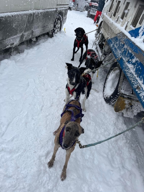 本日は駐車場から橇に4頭つけて、急坂を約200m下りスタートラインへ。